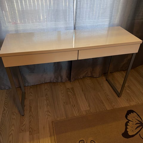 Ikean toimistopöytä, Galant. Pöydän jalkojen korkeus on säädettävä. Pöydän pinta on tyydyttävässä kunnossa. Muuten tukeva työpöytä.