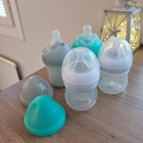 Muumi ja Ainu-pupu tuttipullot sekä pillipullo. Pillipulloa eniten käytetty, tuttipulloja vähemmän mutta kaikki kelvot seuraavallekkin.