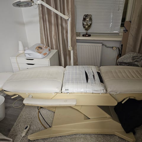 Sähköinen hoitotuoli (hampaanhoito), jossa on musta verhoilu ja metallinen runko sekä pehmustetut käsinojat . Tuolissa on sähköllä säädettävä selkänoja. Jalkatuki ja niskatuki ovat mekaaniset. Soveltuu esimerkiksi hoito-, hieronta- tai kosmetologikäyttöön, jossa tarvitaan säädettävää makuu- ja istuma-asentoa. Mahdollisesti myös nostotoiminto, mutta vivuista kone alkaa toimia muttei nosta. Saattaa olla kiertoruuvi irti.