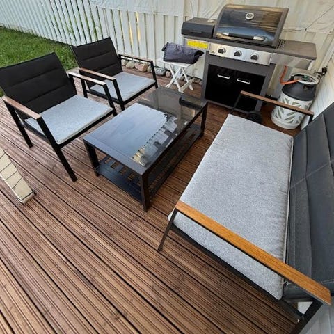 Erittäin hyvä kuntoinen pihakaluste setti. Isohko kulmasohva + pöytä. Mahtuu samanaikaisesti istumaan 5 - 6 henkeä.
