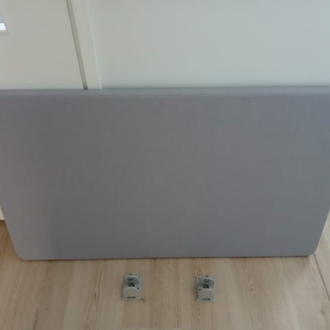 Iskun akustoiva pöytäsermi. Kangas on tummanharmaa. Kiinnike ruuvataan pöydän kanteen. (valkoinen tai harmaa kiinnike)