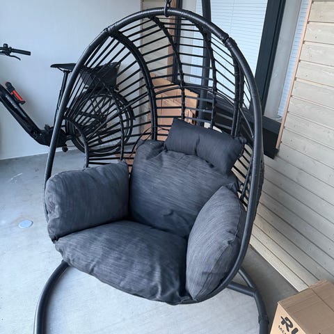 Ollut terassilla talven yli. Kestävä raskas tukeva jalusta, kori kohtuu kevyt. Ei mahdu henkilöautoon. Vain nouto!