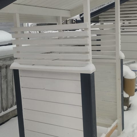 Kaatoallas seinälle,roiskesuoja taakse tukiraudat altaan sivuille kaikki ruostumatonta terästä,lisäksi laskuputki kokonaisena valmiiksi kiinni .
