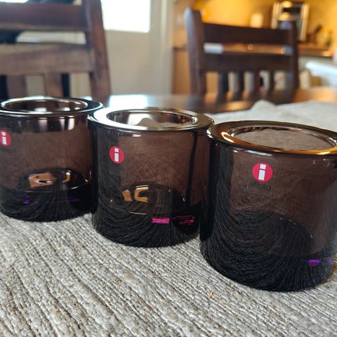 Iittala x Marimekko Kivi-tuikkukipot värissä pomeranssi. 2 kpl, hinta 20€/kpl. Pohja on ohuempi kuin muissa Kivi-tuikuissa, joten saattavat olla 2-laatua sen suhteen. Molemmissa Iittalan tarra ja pohjassa Marimekko-painatus.