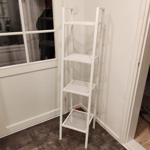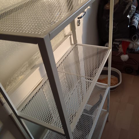 Ikean metallihylly. Säilytetty lasitetulla parvekkeella. Yhdessä hyllyssä ruostetta(?). Ruuvit vaatii kiristystä.