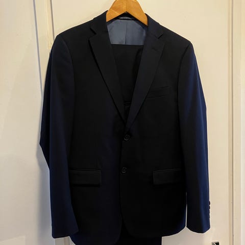 Dressmann Slim Fit miesten puku. Musta kaksiosainen puku, jossa takki ja housut. Takki on slim fit -mitoitusta ja valmistettu polyesteristä. Takin koko 48, housujen kokomerkintä 32–30.