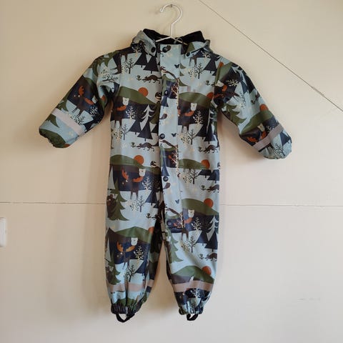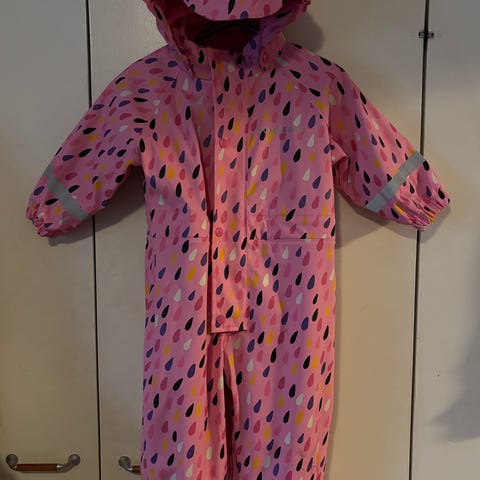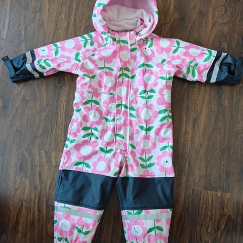 Yhdellä käytetty fleece vuorellinen kurahaalari koko 86, oikein siisti kunto. En ole pessyt nyt kuvausta varten. Jalkalenksut kaipaa vaihtoa.