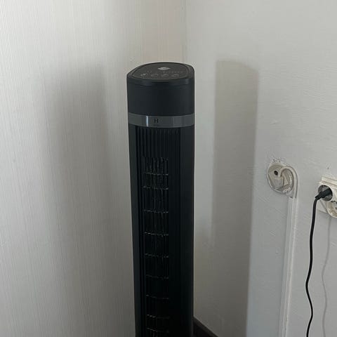 Musta tornituuletin. Laitteessa on ohjauspaneeli yläosassa, josta voi säätää puhallusta useilla painikkeilla (esim. virtapainike, puhallustaso, lämpötila ja ajastintoiminto). Mukana kaukosäädin.