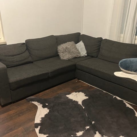 Käytettynä ostettu torista 3,5v sitten. Nyt ollut kissataloudessa, joka näkyy sohvassa. Noin 2.5m leveä, divaaniosan alla säilytystilaa. Santalahdessa, omat kantajat mukaan.