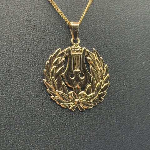 Käyttämättä jäänyt 14K Lyyrariipus keltakultaisella venetsiaketjulla.