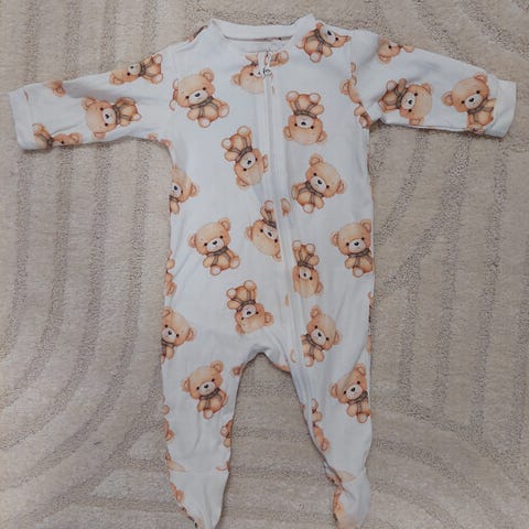 Newbie vauvan yöpuku, koko 62. Unisex-malli, jossa kirjava eläin- ja metsäaiheinen kuosi vaalealla pohjalla. Materiaali 100 % puuvillaa. Pitkät hihat ja pitkät lahkeet, edessä vetoketjukiinnitys. Uusi ja