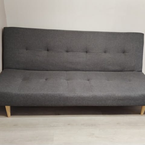 3-istuttava sohva. Muunnettavissa helposti sängyksi. Istuin- ja selkäpehmusteet vaahtomuovia. Jalat massiivipuuta. Yksi jousi irronnut.