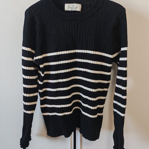Valkoinen neule, jossa kauniit napit. Muutama helmi napeista lähtenyt, ei huomaa käytössä, vain tarkemmin tarkasteltuna.