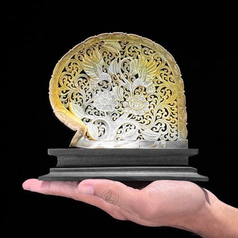 Melo amphora, yleisesti tunnettu nimellä Diadem-voluutta, on erittäin suuri merellinen gastropodi nilviäinen Volutidae-sukuun kuuluvana.Sen maksimiskelin pituus on jopa 500 mm, tavallisesti noin 300 mm.Tämä suuri kuori omaa pyöreän tai lähes soikean siluetin. Sen kolumella on kolme helposti erotettavissa olevaa kaltaista poikittaista uurretta. Avautuma on leveä ja lähes yhtä pitkä kuin itse kuori, eikä sillä ole operkulaa. Sillä on hyvin suuri, pullistunut ja takia laajennettu runkoaalto. Yksi sen tunnetuimmista piirteistä on hartia, jossa on erottuvat ja kaartuvat ontot piikit. Nämä piikit yleensä vanhemmissa kasvuvaiheissa menettävät ilmeensä. Spiraali on yleensä hyvin lyhyt.Melo amphoran kuoren väri sanotaan olevan erittäin vaihteleva. Se on yleisesti pääosin ruskea, valkoinen tai vaaleanoranssi. Yleensä kuorella on spiraalimaisesti tummempia ruskeita juovia. Sisäpuoli on kiiltävä ja yleensä vaalean kerman tai pinkin-oranssin sävyinen.Tämän suurikokoisen merisian olemassaoloa tiedetään sen elävän littoraalisilla ja matalilla sublittoraalisilla vyöhykkeillä. Se asettuu yleensä mutaiseen pohjaan maksimisyvyydellä noin 10 m.LÄHDEMITALLIN DIMENSIONIT - mukaan lukien jalustaKorkeus: 43 cmLeveys: 15 cmPituus: 10 cmHUOMAUTUS- Varmista paikalliselta säädöksiltäsi ja viranomaisilta, onko tämän esineen tuominen maahasi sallittua ennen tarjouksen tekemistä.- Kyseessä on luonnontuote, pienet halkeamat tai puutteet voivat esiintyä. Viitteet kuviin.- Huomioithan, että kuvat on otettu hämärässä studion tilassa, värit voivat vaihdella ympäristön mukaan.- Yhdessä tai useammassa kuvassa esitetään samanlaisen esineen tyylitelty kuva. Tarkan tiedon myytävästä esineestä katso muut kuvat. Mistään tyylitellyssä kuvassa olevista esineistä ei ole myynnissä.- MAINITTU PAINO SISÄLTÄÄ paketoinnin.LÄHETYS- Esine lähetetään seuranta- ja jäljitystunnisteella DHL Parcelin, DPD:n tai postNIn kautta. Seuranta päivittyy Catawiki-huutokauppapaikallesi, kun pakettisi on jätetty kuljetukseen.- Ole hyvä ja tarkista säännöllisesti ettei pakettia palauteta meille, jonka tapauksessa ostaja vastaa toisen lähetyksen kustannuksista.- Espanjaan ja Portugaliin seurannan linkki käyttämällä tätä osoitetta ja lisää Catawiki-tililtäsi saamasi seurantanumerohttps://clientesparcel.dhl.es/LiveTracking/Home- EMME YHDISTÄ HETKEMINEN LÄHETYSTEN KANSSA!!!- Jos sinulla on kysyttävää paketistasi, ota meihin yhteyttä Catawiki-viestipalvelulla. Yritämme vastata kolmessa työpäivässä.
