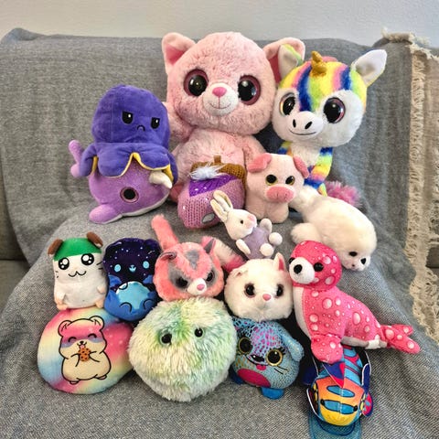 Pehmolelujen lajitelma, jossa erilaisia eläin- ja fantasiahahmoja. Kuvissa näkyy muun muassa koira, leijona, kirahvi, possu, rapu, sammakko, punainen lohikäärme tai dinosaurus, karhu, hylje sekä muita pieniä eläinhahmoja. Useita eri kokoja ja värejä, materiaalina pehmeä kangas ja täyte. Sopii leikkeihin tai sisustuksen yksityiskohdiksi. Myydään yhdessä eränä kuvien mukaisesti.
