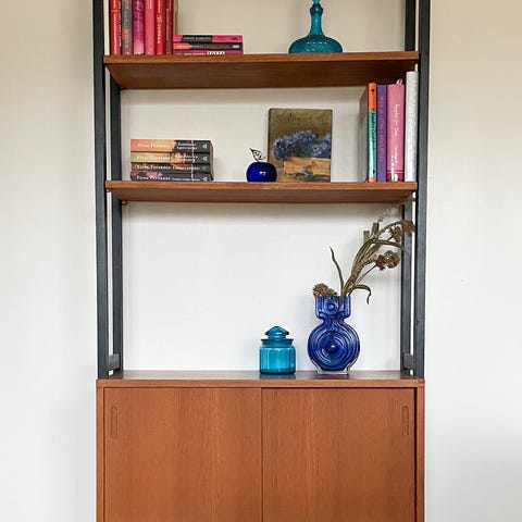 Hyväkuntoinen teak-viilutettu kirjahylly. Kuljetus lisämaksusta ulko-ovelle alueille HKI-Espoo-Vantaa.
