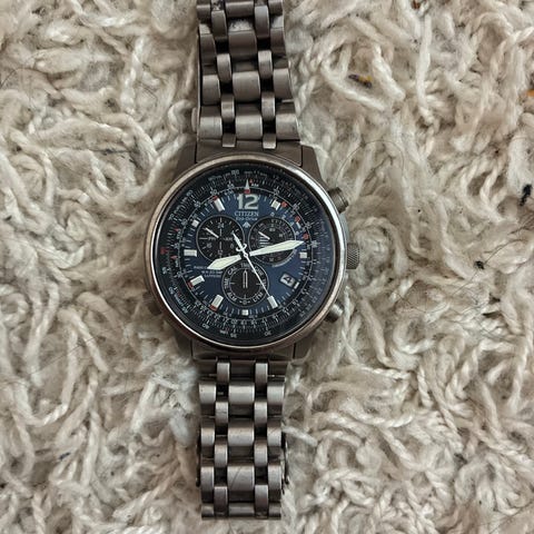 Citizen miesten rannekello teräsrannekkeella ja sinisellä kellotaululla. Kellossa on metallinen ranneke taittosoljella sekä monipuolinen taulu, jossa on erilliset pienemmät osoitinnäytöt ja numeromerkinnät. Kellonkehässä on ilmansuuntamerkinnät. Rakenne on teräksinen ja sopii rannekelloksi miehille arkikäyttöön tai siistimpään pukeutumiseen. Kello on eco-drive joten saa virtansa valosta. Kestää yli 100 päivää pilkkopimeässä virta. Ollut käytössä niin normaalia pientä käytön jälkeä on,muttei mitään isoa. Mukaan tulee jatkopalaa rannekkeeseen jos tarvii pidentää. Siitä hyvä kello joka pysyy ajassa. Vaihtoja voi ehdottaa muihin kelloihin esim Casion Mudmaster ja G-Shock mallit maksan toki väliä jos tarvitaan.