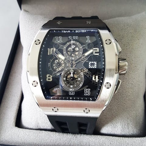New. €680,- retail price. Olemme jalokiviliike, joka myy vain uusia, eksklusiivisia tuotteita. Kaikilla tuotteilla on virallinen takuu, ja asiakirjat allekirjoitetaan ja leimataan omalla jalokiviliikeen tiimillä. Ainutlaatuinen ajanmittokello CCCP-merkiltä. Heidät tunnetaan liikkeistään vuodesta 1924, ja inspiraationsa ammennetaan Neuvostoliiton aikakaudelta, kellosepän historian ikoninen hetki. Nykyään yritys ei ole enää venäläisten omistuksessa. Kelloon sisältyy erityinen automaattinen Slava 2427 -liike. Tämä on ainutlaatuinen johtuen liikkeen sisällä olevasta kaksirunkoisesta jousesta, jolla on 22 jalokiveä. Tämän liikkeen suunnittelu oli jo tuotannossa Neuvostoaikana, ja se on moderni versio tänä päivänä. Liikkeet ovat korkealaatuisia ja kellosepän historian ikoninen osa. Rajoitettu erä, saat satunnaisen numeron väliltä 1 ja 400. Materiaalinen kotelo316L ruostumaton teräsLiikeAutomaattinen Slava 2427, kaksirunkoinen jousi, 22 jalokiveäVarauskapasiteetti 40 tuntia+Ranneke materiaali316L ruostumaton teräsPäivämäärätoimintoKylläKristallin materiaaliKova mineraalilasiKotelon halkaisija42 mmLisävarusteet Laatikot ja asiakirjatToimitus vakuutuksella ja Track & Trace -koodilla. Kaikki uutta.