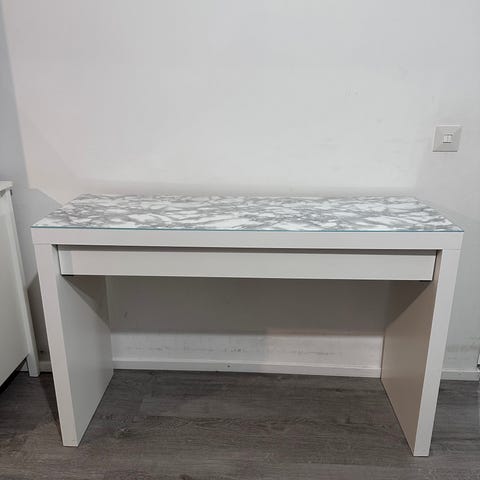 -malm meikkipöytä vetolaatikolla, päällä lasilevy.