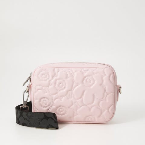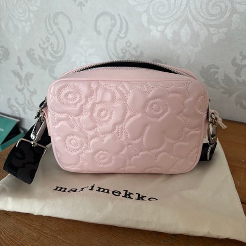 Marimekko nahkainen olkalaukku naisille. Laukku on keltaista nahkaa ja siinä on kohokuvioitu kukkakuosi. Säädettävä olkahihna mahdollistaa laukun kantamisen olalla tai poikittain vartalon yli. Laukussa on vetoketjusuljenta ylhäällä. Soveltuu arjen peruslaukuksi, johon mahtuvat esimerkiksi puhelin, lompakko ja muut pienet tavarat.