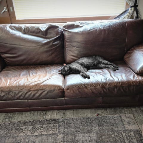 Myynnissä valkoinen kahden hengen nahkasohva. Sohvassa on kissan raapimisjälkiä.
