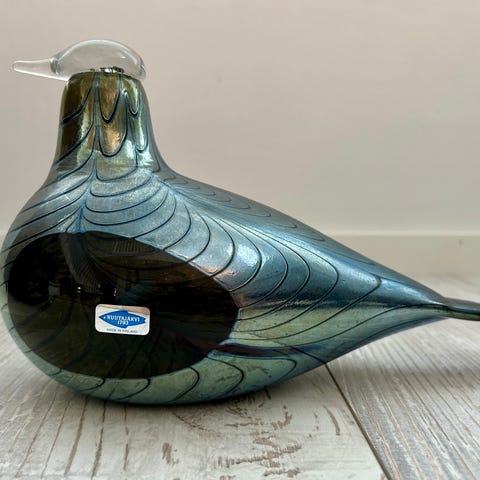 Iittala Oiva Toikka lasilintu lysterilasista. Lintu on muodoltaan pyöreärunkoinen, pitkäpyrstöinen ja pystypäinen. Pinnan koristeena on kaarevia, sulkamaisia raitoja ja monivärinen, metallinhohtoinen lysteripinta, jossa näkyy vihertäviä, sinertäviä ja punertavia sävyjä. Pohjassa on kaiverrus, jossa näkyy suunnittelijan nimi.