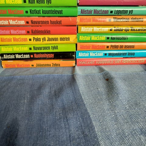 Sekalainen kirjapaketti, joka sisältää useita kovakantisia ja pehmeäkantisia kirjoja. Kokoelmassa on muun muassa salapoliisiromaaneja, kuten A. E. W. Masonin "Myrkky‑nuoli" (WSOY), sekä muita romaaneja ja mahdollisesti sarjakirjoja. Kirjat ovat suomenkielisiä ja eri-ikäisiä painoksia. Sopii esimerkiksi kokoelmaksi tai luettavaksi dekkareiden ja vanhempien romaanien ystäville. MIELUUSTI KAIKKI KERRALLA,TARJOA