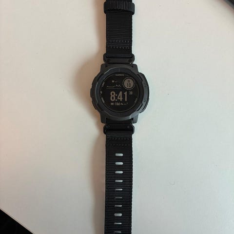 Garmin Instinct urheilukello musta. Digitaalinen näyttö ja ranneke, mukana ylimääräisiä mustia rannekkeita. Sopii ranteeseen säädettävän hihnan ansiosta ja on tarkoitettu käytettäväksi urheilu- ja arkirannekellona.