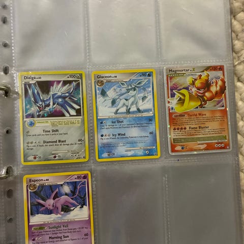 Kuvanmukainen kansio pokemon kortteja sekalaisista seteistä. Kansion saa mukaan.