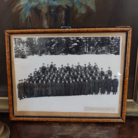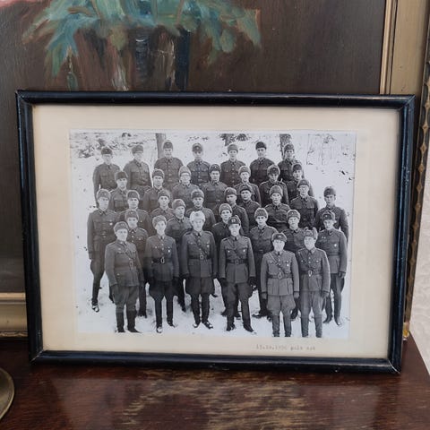 50-luvun sotilaskuva Viestirykmentistä metallisissa kehyksissä. Kehyksissä pientä kulumaa. Lasi ehjä. Koko 24.5 x 18.5 cm.