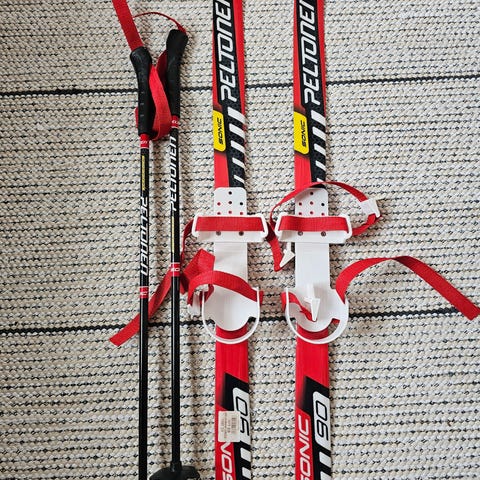Käyttäkuntoiset, omiin kenkiin, vaikka ensisuksiksi. Toinen remmi joka tulisi jalkapöydän päälle puuttuu. Sauvat siistit ja ehjät.