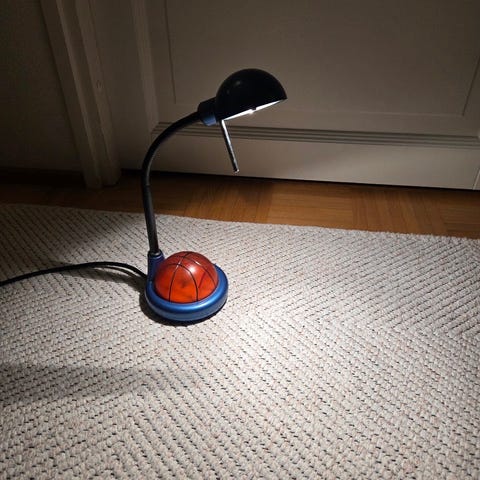 Metallirunkoinen, violetti työ- ja lukuvalo, jossa säädettävä varsi ja nivelöity lampunvarsi valon suuntaamiseen. Lamppu on varustettu pyöreällä jalustalla ja virtajohdossa olevalla katkaisijalla. Sopii esimerkiksi työpöydälle tai yöpöydälle yleis- ja kohdevaloksi. Merkistä ja mallista ei tarkempaa tietoa.