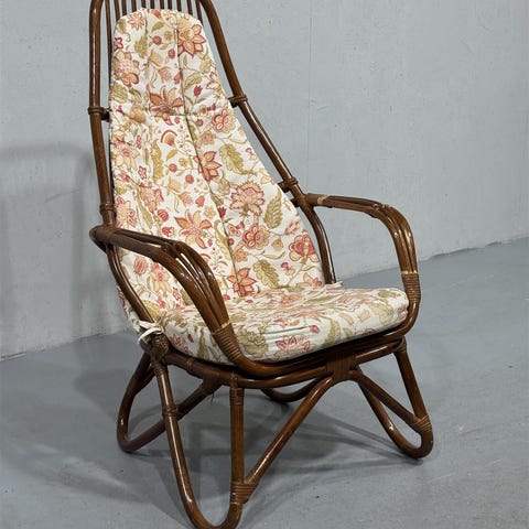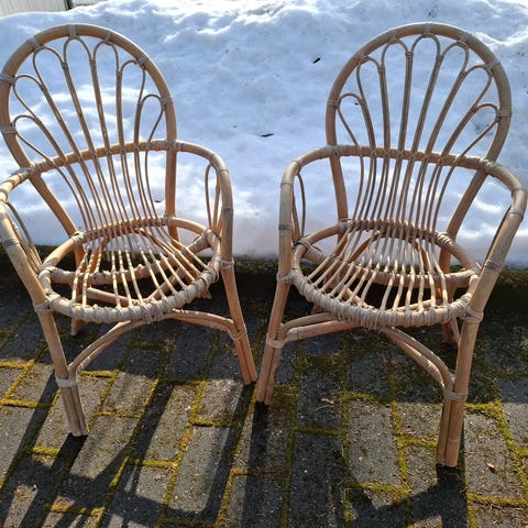Söpö rottinkinen vintage-nojatuoli 50- / 60-luvulta luonnonvärisellä pinnalla. Materiaalina on taivutettu rottinki, jossa on punottuja sidoksia liitoskohdissa. Osa sidoksista kulunut. Kuvissa näkyy yksityiskohtia rottingin sidoksista ja kulumajäljistä, ne ovat huomioitu hinnassa. Erinomaisen mukava tuoli istua.