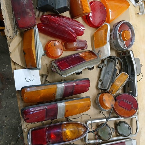 Kaksi paria lampunkehyksiä, yhdet takavalot, listapari. Kaikki kympin kappale.