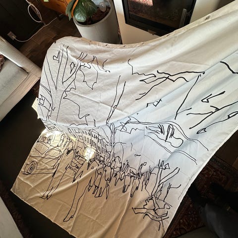 Valmistettu kierrätetystä polyesterista. Yläreunassa 12 metallirengasta ripustinkoukuilla ripustamista varten. Alakäänteessä on painonauha.