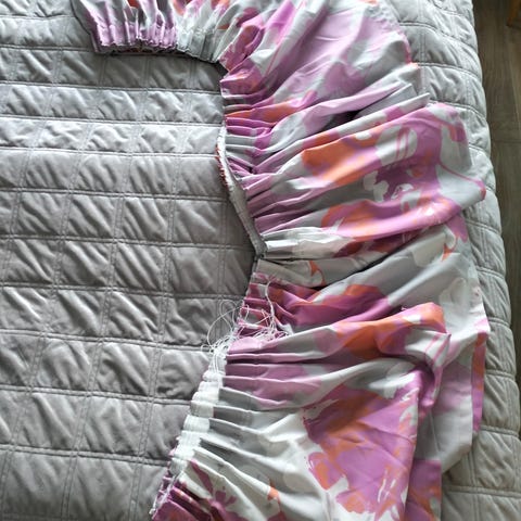 Luonnonvalkoisella pohjalla eri värisiä perhoskuvioita. Kiinteä verhokappa, jossa viimeisessä laskoksessa metallinen vahvike, jotta kappa pysyy ryhdissä. Tehty Eurokangas liikkeessä tilaustyönä. Nyt muuton vuoksi myynnissä uniikki yksilö!