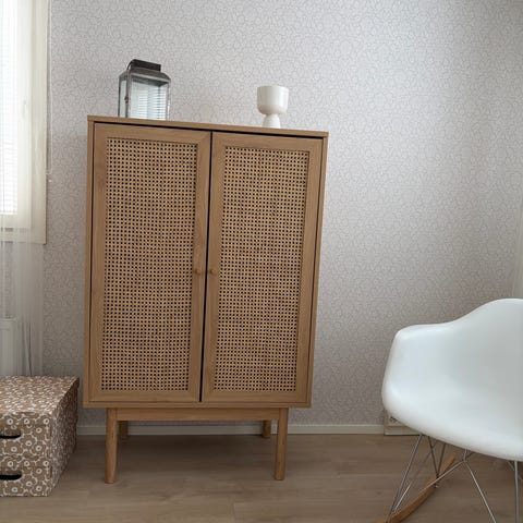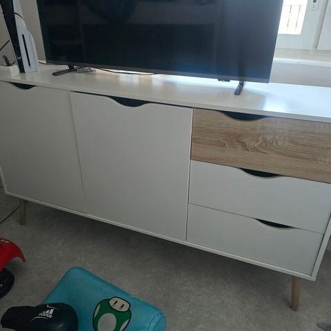 Valkoinen/tammen värinen senkki. Toimii hyvin myös tv-tasona.