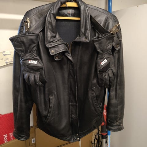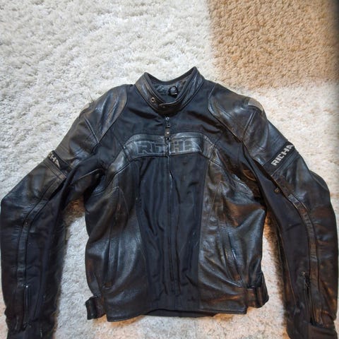 Richa nahkainen moottoripyörätakki, koko 48 (UK 38). Takki on musta, jossa valkoisia raitoja ja suuri Richa-logo edessä ja hihoissa. Materiaalina paksu nahka, sisäpuolella tikattu vuori. Takissa on selkä-olka sekä kyynärpää panssari. Takki siisti vetoketjut toimii.