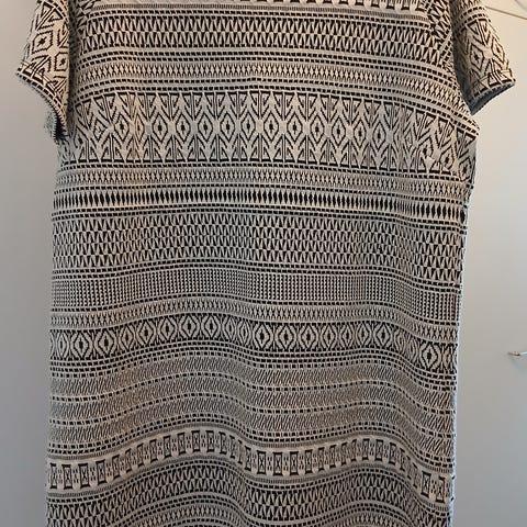 Alusmekko musta, sen päällä alaosasta irti oleva liivimäinen kivasti kuvioitu kangas.