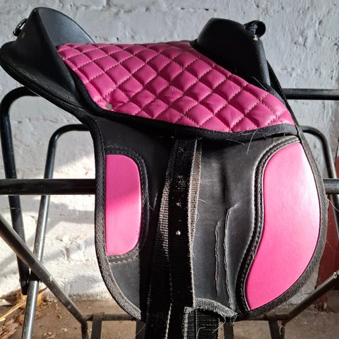 Miniponin satula. Paneelien pituus 35cm. Satulassa sileäpintainen istuin ja polvituet ja lenkit jalustimia varten. Siisti ja ehjä.