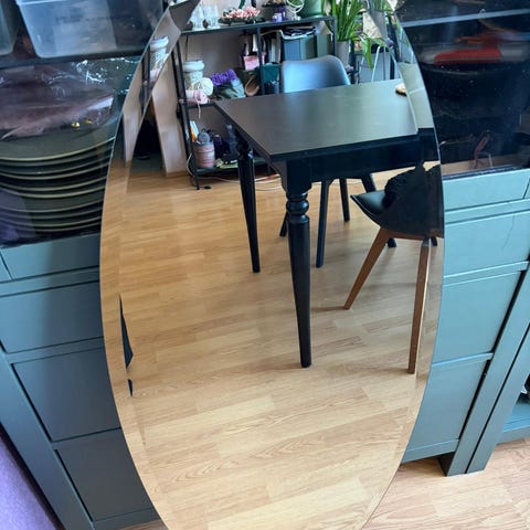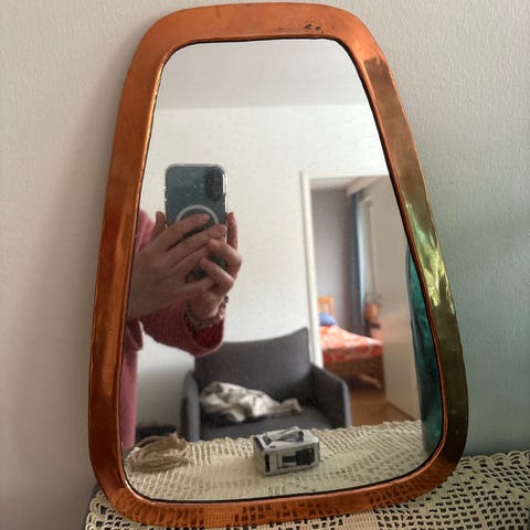 Peili koristeellisella kehyksellä. Suorakaiteen muotoinen peili, jossa on leveä, kohokuvioitu kehys. Kehyksessä on kasviaiheinen ornamentiikka ja se on väriltään kullanruskea. Peili soveltuu esimerkiksi eteiseen, makuuhuoneeseen tai olohuoneeseen seinälle ripustettavaksi. Takana on ripustusvaijeri kiinnitystä varten. Koko 77,5x49 cm.