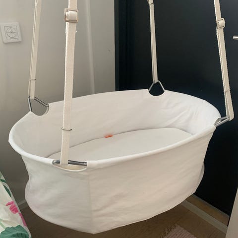 Uudenveroinen todella kaunis Stokken snoozi -sänky. Helposti koottavissa, saa kuvan mukaisesti ala-asentoon, mutta pikkuvauvalle myös ylemmälle tasolle (ei kuvaa). Meillä vauva nukkui tässä 11kk ikään asti. Jämäkkä, mutta siro. Mukaan saa myös kaksi patjaan sopivaa muotoonommeltua lakanaa.
