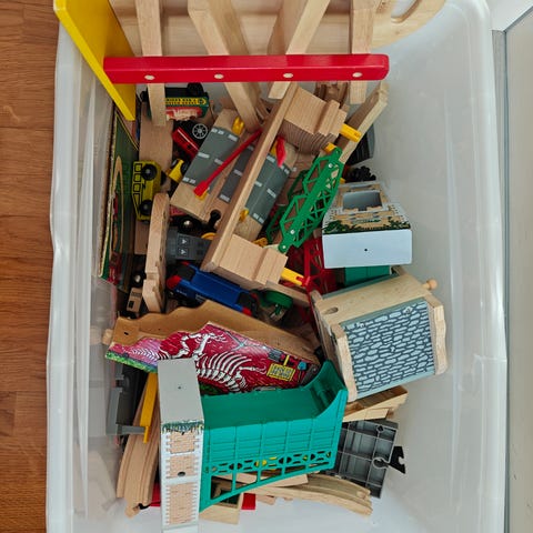 Kasa puujunaradan osia, vaunuja ja oheishärpäkkeitä.