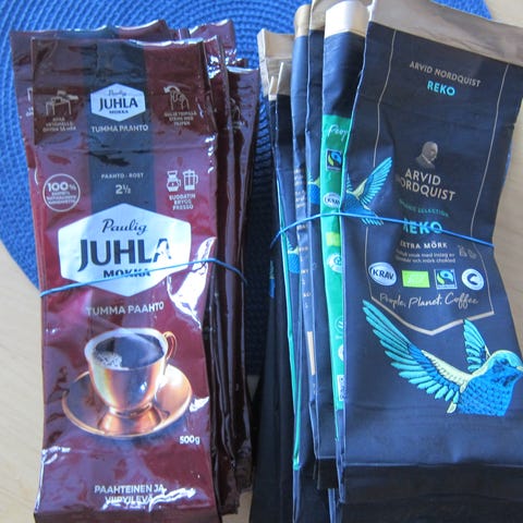 Muovikassillinen tyhjiä kahvipusseja vaikka askarteluun. Suurin osa juhlamokan pusseja mutta pari muutakin lajia löytyy.