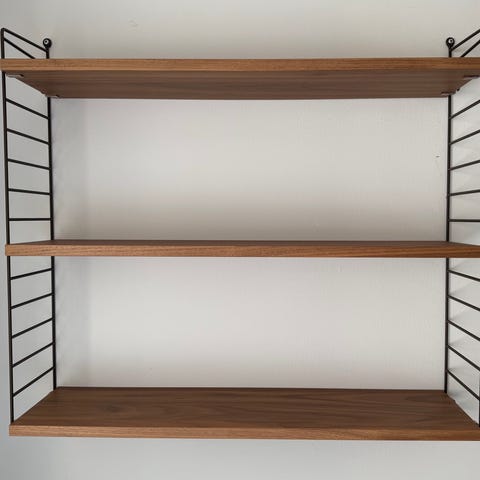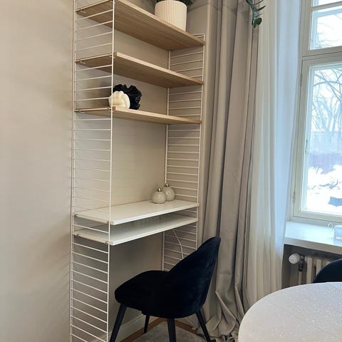 Hyväkuntoinen String pocket hylly värissä saarni. Jotain ihan pieniä jälkiä huomasin metalliosissa ja seinästä jäänyt vähän maalia kiinni niihin kohtiin, jotka siis ovat kosketuksissa seinään. Ei pitäisi näkyä kun hylly paikallaan. Hyllylevyissä en huomannut vikoja. Vain nouto Mellunmäestä.