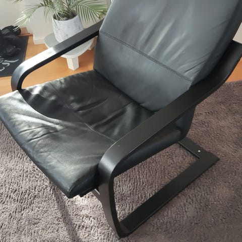 Tumman ruskea nojatuoli toimivalla mekanismilla, jolla pääsee lähes makuuasentoon. Jalkatuki ponnahtaa esiin vivusta. Nahka on täysin ehjä kaikkialta ja todella hyvässä kunnossa. Valmistajasta ei ole muistikuvaa eikä löytynyt merkintöjä, nahka aitoa. Todella mukava löhöily tuoli, joka valitettavasti tilan puutteen takia on nyt myynnissä. Taloudessa ei ole lemmikkejä.
