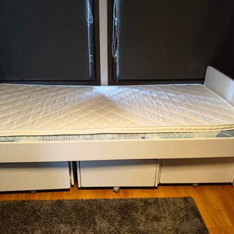 BILLUND sänkykehikko säilytystilalla 90x200. Sänky ja toinen säilytyslaatikoista valmiiksi purettuna. Yksi lauta poikki, ei ole haitannut käyttöä. Mitat koottuna L99 x P205 x K75 cm.