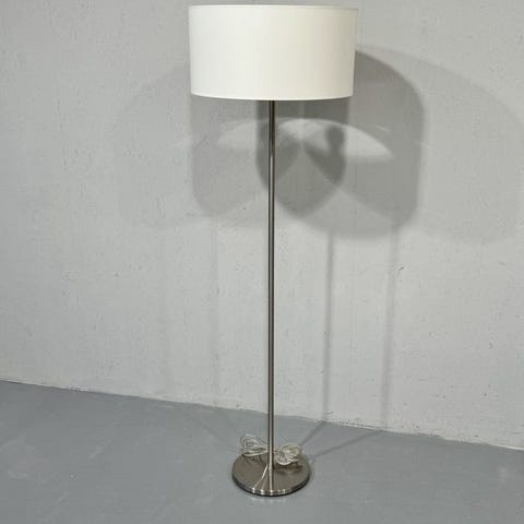 Brilliant-merkkinen lattiavalaisin, jossa on kaksi valonlähdettä. Yläosa on suunniteltu antamaan laajaa valaistusta, kun taas alempi osa on suunnattava lukuvalo. Valaisimessa on musta runko ja valkoiset varjostimet.