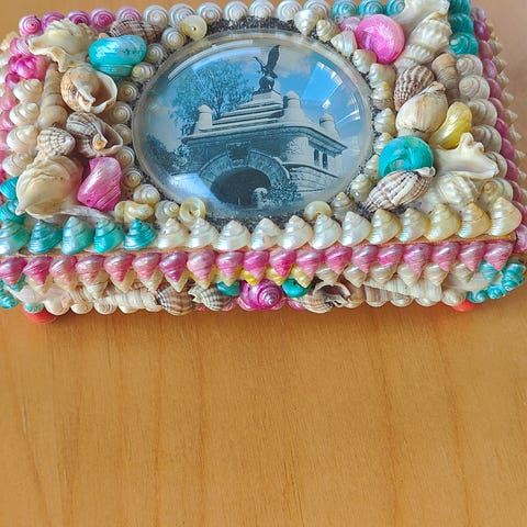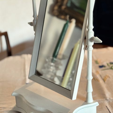 Vanha, pieni ja keltainen piianpeili. Ikäänsä nähden hyvässä kunnossa.