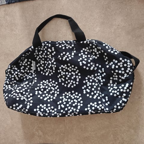 Erittäin vähällä käytöllä ollut Aarikan pallokuvioinen kassi, minkä kankaan kuosissa piilossa muutama tuttu Aarikan pässi. Vankkaa, kestävää kangasta. Vetoketju myös kassin sisällä olevassa sivutaskussa.